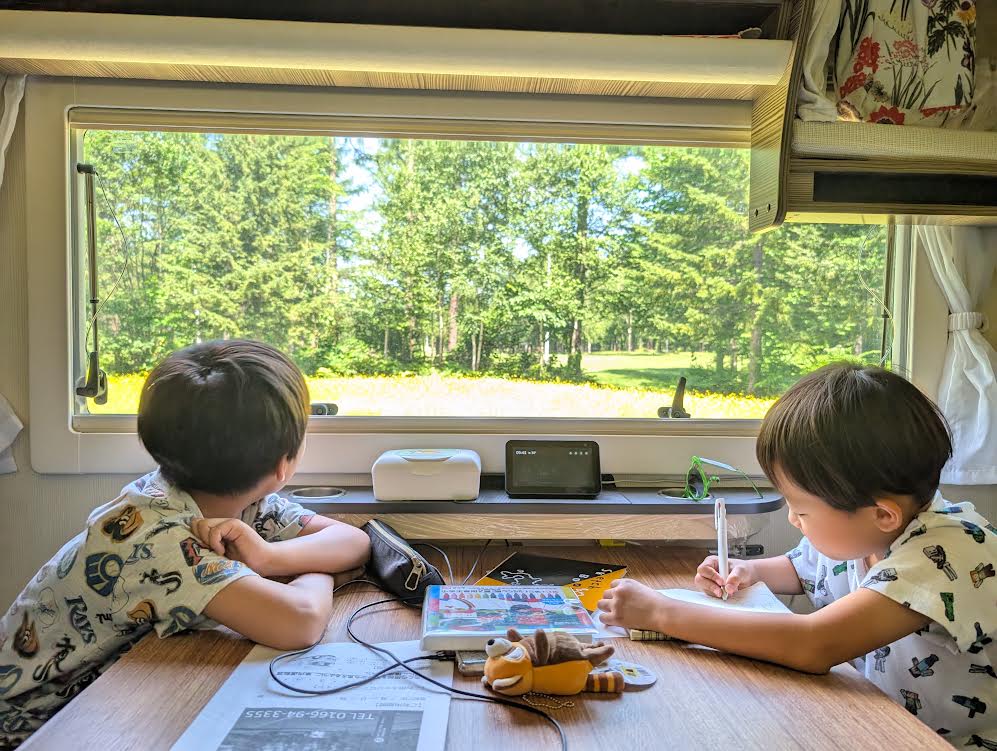 夏休みの図画の宿題に、キャンピングカーから見える北海道の景色を兄弟で描いていました。