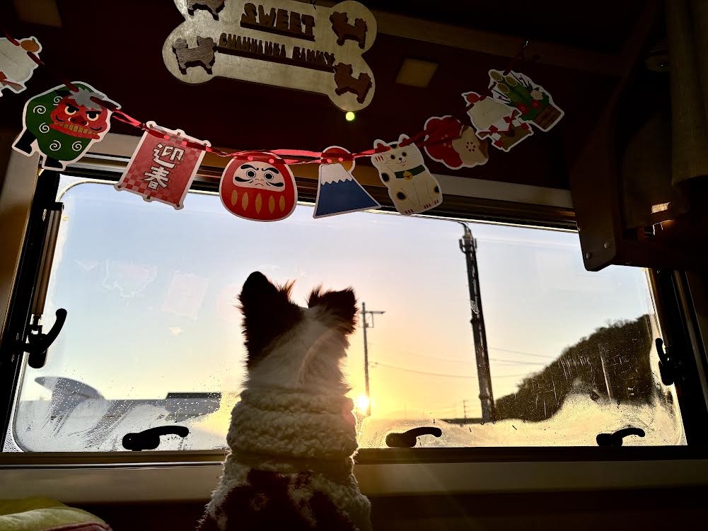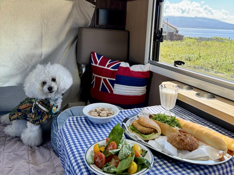 地元のパン屋さんで焼きたてのパンを買って、利尻富士を眺めながらワンコと一緒に絶景モーニング。